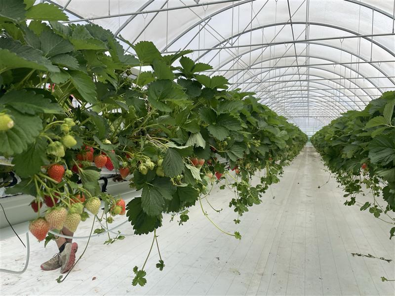 Cette serre fraise se distingue par des équipements adaptés : une aération par enroulement au chéneau, garantissant une régulation optimale du climat, et des gouttières suspendues pour les fraisiers. « Ce système permet non seulement d’optimiser mon espace de production, de faciliter le travail quotidien, mais aussi d’améliorer la qualité sanitaire des plants. »